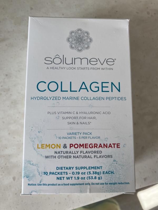 Упаковка розпаковано і немає одного пакета,тобто 9шт. з 10 шт.Пептиди морського колагену, вітамін С та гіалуронова кислота, асорті зі смаком лимона та граната, 10 пакетиків по 5,38 г (0,19 унції)