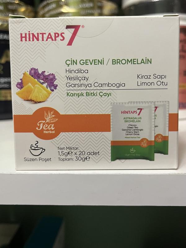 Hintabs7 Астрагал Бромелайн - смешанный травяной чай, Детокс чай. Свойства чая - улучшает иммунитет, нормализует обмен веществ, бодрит, придает силы, улучшает письмо, хорошо снимает оттеки, способствует сжиганию жира, выводит токсины из организма, сохраняет высокую кровь энергии в течении дня, способствует потере весы, на миме. 20 пакетиков. Производство Турция.