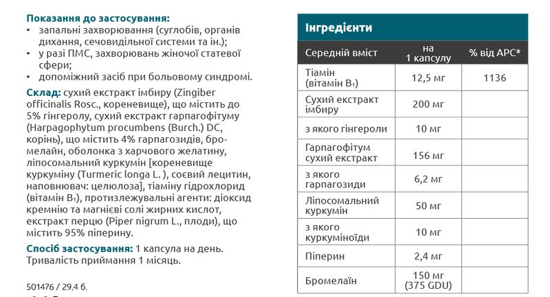 Показання до застосування: • запальні захворювання (суглобів, органів дихання, сечовидільної системи та ін.); • у разі ПМС, захворювань жіночої статевої сфери; • допоміжний засіб при больовому синдромі. Склад: сухий екстракт імбиру (Zingiber officinalis Rosc., кореневище), що містить до 5% гінгеролу, сухий екстракт гарпагофітуму (Harpagophytum procumbens (Burch.) DC, корінь), що містить 4% гарпагозидів, бро- мелайн, оболонка з харчового желатину, ліпосомальний куркумін [кореневище куркуміну (Turmeric longa L. ), соєвий лецитин, наповнювач: целюлоза], тіаміну гідрохлорид (вітамін B1), протизлежувальні агенти: діоксид кремнію та магнієві солі жирних кислот, екстракт перцю (Piper nigrum L., плоди), що містить 95% піперину. Спосіб застосування: 1 капсула на день. Тривалість приймання 1 місяць