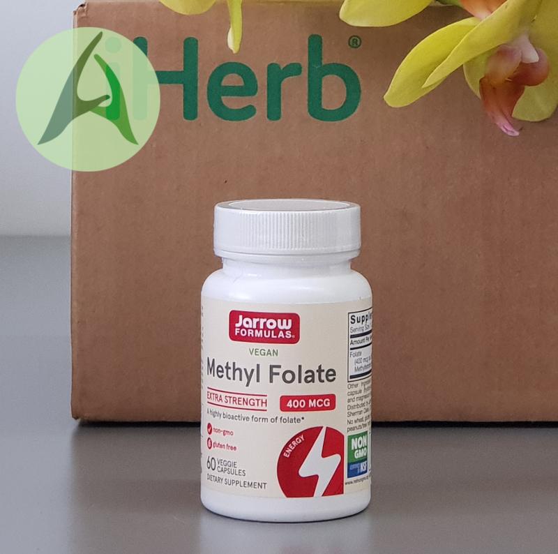 Jarrow Formulas, веганский метилфолат, повышенной силы действия, 400 мкг, 60 растительных капсул Описание - (6S)-5-метилтетрагидрофолат глюкозаминовая соль - Технология производства фолиевой кислоты 4-го поколения - Биологически активная форма фолата - Quatrefolic® - Не содержит ГМО -- сертификат NSF - Пищевая добавка - Веганский продукт Метилфолат ((6S)-5-метилтетрагидрофолат или (6S)-5-MTHF) -- это эффективная биологически активная форма фолата. Из-за ограниченной способности организма преобразовывать синтетическую фолиевую кислоту в активную форму фолата следует принимать 5-MTHF. Информация о пользе для здоровья. Содержание необходимого количества фолата в рационе беременной женщины может снизить риск возникновения врожденных дефектов развития головного и спинного мозга у ребенка. Рекомендации по применению Принимать по 1 капсуле в день независимо от приема пищи или в соответствии с рекомендациями врача. Ингредиенты Целлюлоза, вегетарианская капсула (гидроксипропилметилцеллюлоза, вода) и стеарат магния (растительного происхождения). Предупреждения Примечание. Перед началом применения во время беременности, при планировании беременности, в период лактации, в возрасте до 18 лет, при наличии каких-либо заболеваний (в особенности эпилепсии или при прохождении химиотерапии) проконсультируйтесь с врачом. При возникновении побочных реакций прекратите использование. Хранить в недоступном для детей месте. Хранить в сухом и прохладном месте. Пищевая ценность Размер порции: 1 капсула Количество в 1 порции % от суточной нормы Фолат (400 мкг в виде (6S)-5-MTHF ((6S)-5-метилтетрагидрофолат глюкозаминовая соль)) 680 мкг пищевого фолатного эквивалента† 170% † Пищевой фолатный эквивалент.