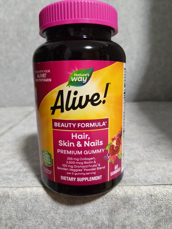 Описание Принимайте вместе с мультивитаминами Alive® Формула краси Диетическая добавка С растительным пектином 255 мг коллагена, 2500 мкг биотина и 100 мг порошковых смесей Orchard Fruits TM и Garden VeggiesTM в 1 порции из двух жевательных мармеладок. Премиальная формула для красоты волос, кожи и ногтей Поддерживает блестящие волосы, крепкие ногти и сияющую кожу. Содержит гидролизованный коллаген, биотин, диоксид кремния и лютеин Высокоэффективные антиоксидантные витамины С и E в порции из 2 жевательных мармеладок для защиты от свободных радикалов Содержит растительный пектин Премиальная формула с порошковыми смесями Orchard FruitsTM и Garden VeggiesTM (100 мг в порции из 2 жевательных мармеладок