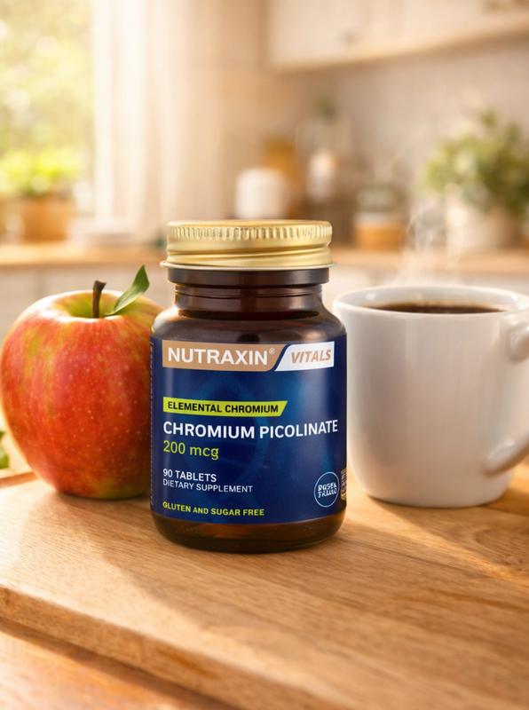 Nutraxin Chromium Picolinate (200 мкг) — ✅ Користь та заявлені ефекти 1. Добавка містить хром у формі піколінату (200 мкг на таблетку).  2. Згідно з описами: • Хром сприяє нормальному метаболізму макроелементів (вуглеводів, жирів, білків).  • Може допомагати контролювати рівень глюкози в крові, підвищувати чутливість до інсуліну.  • Допомагає зменшити тягу до солодкого / вуглеводів та підтримати обмін речовин, що може бути корисним при контролі ваги.