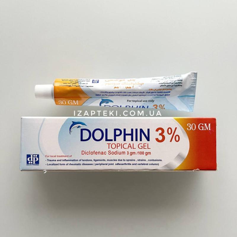 Dolphin 3% гель Состав: Каждые 100 г геля содержат: Диклофенак натрия - 3 г. Долифин гель - водно-спиртовой гель, является противовоспалительным и обезболивающим препаратом. Обладает охлаждающим и успокаивающим эффектом. Показания: Для местного лечения: посттравматическое воспаление сухожилий, связок, мышц и суставов, например, из-за растяжения, деформации и ударов. Локализированные формы не суставного ревматизма мягких тканей (бурсит, синдром плечевого сустава). Локелизированные формы дегенеративного ревматизма, например остеоартроз периферических суставов и позвоночника. Способ применения: Гель следует наносить на кожу (только на неповрежденные участки) 3-4 раза в день и аккуратно втирать
