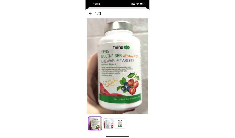 TIENS Multi-Fiber з вітаміном D₃ Тяньши Мультифайбер з вітаміном D₃ 60 жевательных табл. TIENS Multi-Fiber з вітаміном D₃ Жувальні таблетки з високим вмістом клітковини, вітаміну D₃, натурального вітаміну С, ароматом лісових фруктів, сумішшю рослинної клітковини, а також порошком плодів глоду і екстрактом плодів ацероли, рослинними підсолоджувачами ксилітом та стевією, натуральним барвником з коренеплоду буряка. Жувальні таблетки «TIENS Multi-Fiber з вітаміном D₃» підвищать Ваше щоденне споживання клітковини. Вітаміни С та D₃ сприятимуть нормальній функції імунної системи. Також вітамін D необхідний для нормального росту і розвитку кісток у дітей. Склад: полідекстроза (80% дієтичної клітковини); кукурудзяна клітковина (IM олігосахариди, стійкі до травлення); яблучний (Malus pumila Mill.) порошок (45% дієтичної клітковини); акацієва (Acacia senegal L.) камідь (80% дієтичної клітковини); мікрокристалічна целюлоза (100% дієтичної клітковини); підсолоджувач: ксиліт; порошок зерен вівса (Avena sativa L.) (96% дієтичної клітковини); порошок глоду (Crataegus oxyacantha); концентрат буряка червоного (Beta vulgaris L.); екстракт плодів ацероли (Malpighia glabra L.) (50% вітаміну C); ароматизатор лісових фруктів; стабілізатор: солі магнію жирних кислот; порошок кореня моркви (Daucus carota L.) (60% дієтичної клітковини); підсолоджувач: стевіоглікозиди у порошку з листя стевії (Stevia rebaudiana); регулятор кислотності: лимонна кислота; холекальциферол (вітамін D₃). Рекомендована денна норма: 1-3 таблетки двічі на день (до 6 таблеток/день). Не перевищувати рекомендовану денну норму. Протипоказання: не рекомендовано вживати дітям до 3 років, вагітним, жінкам у період лактації і людям, які мають алергію на інгредієнти продукту.
