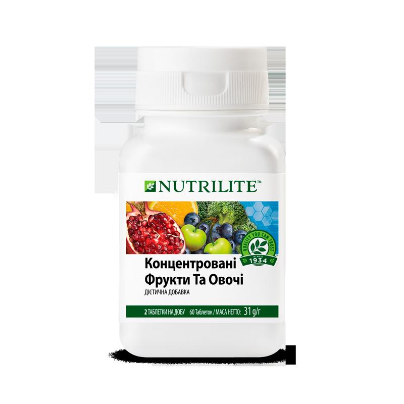 Концентрированные фрукты и овощи NUTRILITE - ексклюзивная формула, которая обеспечивает наш организм специально отобранными фитонутриентами из фруктов и овощей. Рекомендованная доза Употребляйте по одной таблетке дважды на день во время еды. Подходит для диабетиков (стоит включить в обычную программу питание) Не содержит клейковины Не содержит лактозы Концентрированные фрукты и овощи NUTRILITE созданы скорее как дополнение витаминов, минералов и фитопитательных веществ, имеющихся в таких поливитаминных мультиминеральних фитопитательных диетических добавках, как NUTRILITE Дейли и NUTRILITE DOUBLE X™, а не как их замена. Храните в недоступном для детей месте. Этот продукт не может заменить полноценного питания. Не превышайте рекомендуемую суточную дозу. Храните бутылку плотно закрытой. Этот продукт не предназначен для замены потребления фруктов и овощей в ежедневном рационе. Он подходит большинству взрослых и детям старше 12 лет. Дети младше 12 лет, беременные женщины и кормящие матери или кто-либо, чье состояние здоровья требует особенного внимания с медицинской точки зрения, должны проконсультироваться с врачом перед началом употребления этого продукта.