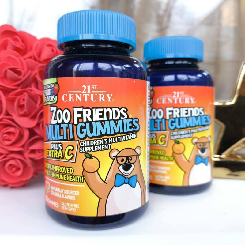 21st Century Zoo Friends Мультивитаминные жевательные мармеладки с отличным вкусом, 60 желеек Сбалансированная мультивитаминная и минеральная формула для детей! Производство США. Детские витамины Zoo Friends от 21st Century разработаны, чтобы помочь детям получать большое количество незаменимых витаминов и микроэлементов, необходимых для здорового роста и развития. Этот комплекс имеет приятный вкус и с легкостью покроет ежедневные базовые потребности детского организма в питательных веществах. Вашим детям понравится эта вкусная ежедневная добавка! Каждая порция жевательных мармеладок содержит важные питательные вещества, которые могут помочь поддерживать общее состояние здоровья, такие как витамины A, B6, C, D и E, а также микроэлементы, такие как йод и цинк. Не содержат желатина и глютена. Рекомендации по применению: Детям от 2 до 3 лет принимать 1 желейку в день, детям 4 лет и старше — 2 желейки в день с любым приемом пищи. Убедитесь, что ваш ребенок тщательно жует жевательную таблетку.
