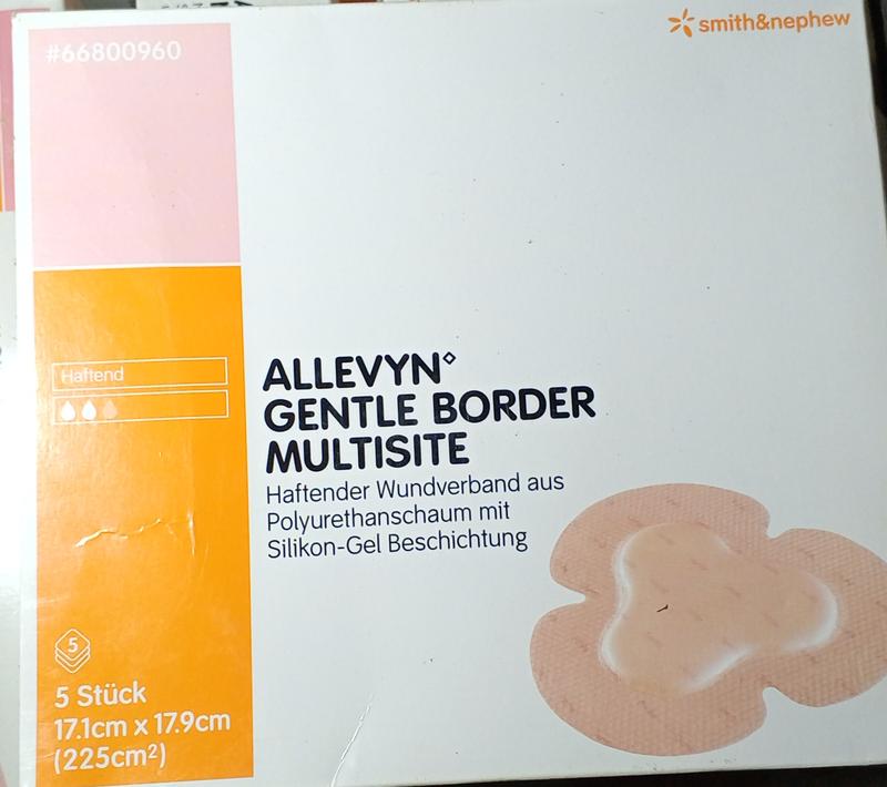 Прострочено — срок использования истек. Название товара: Повязка ALLEVYN Gentle Border Multisite Код: 66800960 Размер: 17,1 см × 17,9 см (225 см2) Количество в упаковке: 5 штук Тип: Самоклеющаяся гидроцеллюлярная повязка с силиконовым краем Производитель: Smith & Nephew, Большая Британия Стерильность: Стерильная при неповрежденной упаковке Продолжительность носки: до 7 дней Описание: ALLEVYN Gentle Border Multisite - это специально сформированная повязка с мягким силиконовым краем, разработанная для сложных анатомических зон: колени, локтя, льды, шеи, паха, подмышек, затылка, плеча, грудной клетки, бедра, голени и стопы. Повязка обеспечивает эффективное поглощение экссудата, уменьшает риск мацерации и создает влажную среду, благоприятную для заживления ран. Показания к применению: – Пролежни – Выразительные нижние конечности – Диабетические язвы стопы – Послеоперационные раны – Донорские участки кожи – Опики I–II степени – Онкологические и инфицированные раны – Буллезные дерматозы – Раны в сложных или подвижных участках тела Преимущества: – Анатомическая форма для сложных участков – Мягкий силиконовый край не травмирует кожу – Высокая абсорбция и контроль влаги – Можно оставлять до 7 дней – Водонепроницаемая, но дышащая внешняя пленка – Подходит для чувствительной кожи Нестандартное использование (не по назначению): Предостережение: не рекомендовано производителем, но возможно в быту или творчестве. – Защита кожи от натирания под ремнями, спортивным снаряжением или протезами – Временная подкладка под медицинские маски, шлемы или ортезы – Мягкий амортизирующий слой в обуви или под технику – В творческих проектах в виде гибкого текстильных элементов или декоративной вставки – Как охлаждающий компресс после косметических процедур или легких ожогов Внимание: Не использовать с окислительными веществами (например, перекиси водорода). Не глотать. Все альтернативные способы использования — на свой риск. #66800960 *smith&nephew Haftend ALLEVYN GENTLE BORDER MULTISITE Haftender Wundverband aus Polyurethanschaum mit Silikon-Gel Beschichtung 5 5 Stück 17.1cm x 17.9cm (225cm²) #66800960 Haftend 5 Stück 17.1cm x 17.9cm (225cm²)