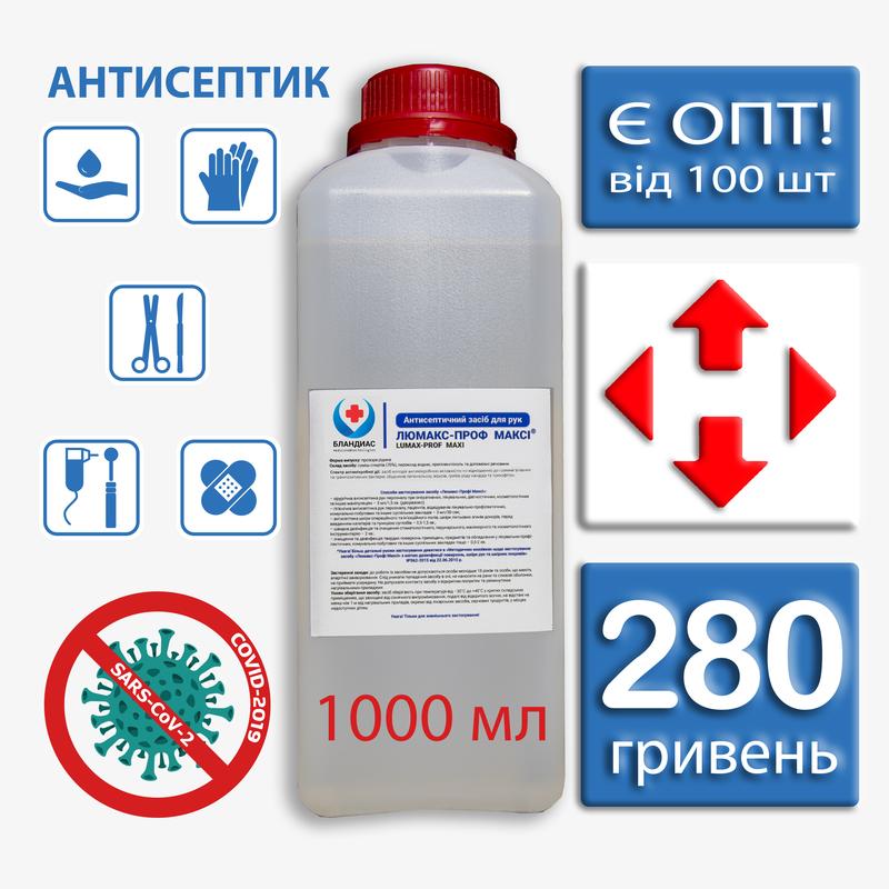Це заводський потужний швидкодіючий дезінфікуючий засіб, який можна використовувати як для обробки шкіри так і для інструментів. У складі є пропіленгліколь, який відповідає за зволоження і пом'якшення шкіри. Головним чином, за антисептичні властивості відповідають спирти, яких в складі 70%. Зверніть увагу, що ізопропіловий спирт має запах на багато різкіше і грубіше, ніж етиловий. Оптові ціни на антисептик від 100 од. ПРИЗНАЧЕННЯ ЗАСОБУ: Хірургічна антисептика рук персоналу при оперативних, лікувальних, діагностичних, косметологічних та інших маніпуляціях; Гігієнічна антисептика рук персоналу, пацієнтів, відвідувачів лікувальнопрофілактичних, комунально-побутових та інших суспільних закладів; Знезараження рукавичок в латексу, неопрену, нітрилу та інших матеріалів; Антисептика шкіри операційного та ін’єкційного полів, шкіри ліктьових згинів донорів, перед введенням катетерів та пункцією суглобів; Дезінфекція шкірних покривів та шкіри ніг з метою профілактики грибкових та інших інфекцій; Швидка дезінфекція та очищення стоматологічного, перукарського манікюрного та косметологічного інструментарію; Швидка дезінфекція та очищення поверхонь приміщень, предметів та обладнання у лікувально-профілактичних, комунально-побутових та інших суспільних закладах тощо. Форма випуску: прозора рідина. Склад суміш спиртів 70% (ізопропіловий і етиловий), пероксид гідрогену, пропіленгліколь, ефірна олія, дистильована вода. Спектр антимікробної дії: засіб володіє антимікробною активністю по відношенню до грамнегативних та грампозитивних бактерій, включаючи мікобактерії туберкульозу, збудників легіонельозу, вірусів (збудники поліомієліту, парентеральних гепатитів, ВІЛ інфекції), грибів роду кандіда та трихофітон. Способи застосування засобу «Люмакс-Проф Максі»: – хірургічна антисептика рук персоналу при оперативних, лікувальних, діагностичних, косметологічних та інших маніпуляціях – 3 мл/1,5 хв. (дворазово); – гігієнічна антисептика рук персоналу, пацієнтів, відвідувачів лікувально-профілактичних, комунально-побутових та інших суспільних закладів – 3 мл/30 сек; – антисептика шкіри операційного та ін’єкційного полів, шкіри ліктьових згинів донорів, перед введенням катетерів та пункцією суглобів – 0,5-1,5 хв.; – швидка дезінфекція та очищення стоматологічного, перукарського, манікюрного та косметологічного інструментарію – 2 хв.; – очищення та дезінфекція твердих поверхонь приміщень, предметів та обладнання у лікувально-профілактичних, комунально-побутових та інших суспільних закладах тощо – 0,5-2 хв. *Увага! Більш детальні умови застосування дивитися в «Методичних вказівках щодо застосування засобу «Люмакс-Профі Максі» з метою дезинфекції поверхонь, шкіри рук та шкірних покривів» №562-2015 від 22.06.2015 р. Застережні заходи: до роботи із засобом не допускаються особи молодше 18 років та особи, що мають алергічні захворювання. Слід уникати попадання засобу в очі, не наносити на рани та слизові оболонки, не приймати усередину. Не допускати контакту засобу з відкритим полум’ям та увімкнутими нагрівальними приладами. Умови зберігання засобу: засіб зберігають при температурі від –30˚С до +40˚С у критих складських приміщеннях, що захищені від сонячного випромінювання, подалі від відкритого вогню, на відстані не менш ніж 1 м від нагрівальних