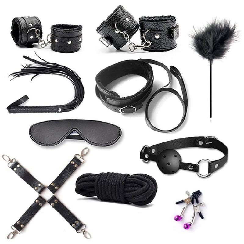 БДСМ набор (Бандажный набор, набор доминирования) из 10 предметов: 1. Кожаная маска на резинке, с внутренней стороны мягкая ткань (19х7 см). 2. Кляп: пластиковый шарик с отверстиями на кожаном ремешке с регулируемой застежкой (длина ремешка 62 см, диаметр шара 4,5 см). 3. Кожаный ошейник с поводком. С внутренней части ошейника искусственный мех, есть полукольцо для поводка и ремешок с регулируемой застежкой (43х5 см., ремешок + 8 см.). Кожаный поводок с карабином и держателем для руки (97х1 см). 4. Кожаные наручники, с внутренней части искусственного меха, на ремешке с регулируемой застежкой, соединенные цепочкой с карабином на одной стороне (27х5 см., ремешок + 10 см). 5. Кожаные поножи, с внутренней части искусственного меха, на ремешке с регулируемой застежкой, соединенные цепочкой с карабином на одной стороне (27х5 см., ремешок + 10 см). 6. Кожаный крестовой фиксатор для соединения наручников и пандеров с карабинами (25х2 см.). 7. Бандажная веревка (4,8 метра). 8. Кожаная батиг, деревянная ручка обмотана кожа и держатель для руки и 20 тонких полосок (ручка 16 см. полоски 32 см.). 9. Перчик для лаок с пластиковой ручкой (ручка 16 см., Перья 10 см.). 10. Металлические зажимы для соска с резиновыми наконечниками, шурупом регулятором и маленьким колокольчиком (6 см.).