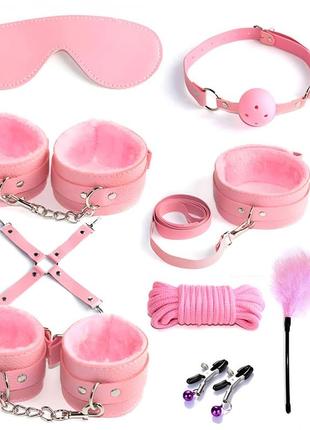 БДСМ набір (Бандажний набір, набір домінування) з 10 предметів: 1. Шкіряна маска на гумці, з внутрішньої сторони м'яка тканина (19х7 см). 2. Кляп: пластикова кулька з отворами на шкіряному ремінці з регульованою застібкою (довжина ремінця 62 см, діаметр кулі 4,5 см). 3. Шкіряний нашийник з повідцем. З внутрішньої частини нашийника штучне хутро, є півкільце для повідця та ремінець з регульованою застібкою (43х5 см., ремінець + 8 см.). Шкіряний повідець з карабіном та тримачем для руки (97х1 см.). 4. Шкіряні наручники, з внутрішньої частини штучного хутра, на ремінці з регульованою застібкою, з'єднані ланцюжком з карабіном на одній стороні (27х5 см., ремінець + 10 см.). 5. Шкіряні поножі, з внутрішньої частини штучного хутра, на ремінці з регульованою застібкою, з'єднані ланцюжком з карабіном на одній стороні (27х5 см., ремінець + 10 см.). 6. Шкіряний хрестовий фіксатор для з'єднання наручників та паножів з карабінами (25х2 см.). 7. Бандажна мотузка (4,8 метра). 8. Шкіряна батіг, дерев'яна ручка обмотана шкіра та тримач для руки та 20 тонких смужок (ручка 16 см. смужки 32 см.). 9. Перчик для ласок з пластиковою ручкою (ручка 16 см., Пір'я 10 см.). 10. Металеві затискачі для сосків з гумовими наконечниками, шурупом регулятором та маленьким дзвіночком (6 см.).