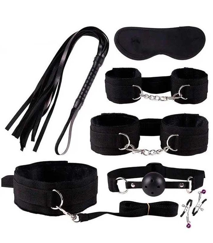 Тип виробу: Інтимні іграшки 7 инструментов страстных пыток. В набор входят: 1. Велюровая маска на глаза на резинке, с внутренней и внешней стороны велюр (19*7 см) = 60 грн 2. Кляп: пластиковый шарик с отверстиями на кожаном ремешке с регулируемой застежкой (длина ремешка 62 см, диаметр шара 4,5 см) = 125 грн 3. Ошейник с поводком. С внутренней части ошейника искусственных мех, есть полукольцо для поводка и ремешок с регулируемой застежкой (43х5 см, ремешок + 8 см). Поводок с карабином и держателем для руки (97х1 см) = 190 грн 4. Наручники, с внутренней части искусственных мех, на ремешке с регулируемой застежкой, соединены цепочкой с карабином на одной стороне (27х5 см., ремешок + 10 см) = 200 грн/пара 5. Поножи, с внутренней части искусственных мех, на ремешке с регулируемой застежкой, соединены цепочкой с карабином на одной стороне (27х5 см., ремешок + 10 см) = 200 грн/пара 6. Кожаная плетка, деревянная ручка обмотанная кожей, держатель для руки и 20 тонких полосок из кожи (ручка 16 см. полоски 32 см) = 125 грн 7. Металлические зажимы для сосков с резиновыми наконечниками, шурупом регулятором и маленьким колокольчиком (6 см) = 60 грн Цвет: черный Цена комплекта из 7 предметов = 850 грн Можно купить любой из 7 предметов отдельно.