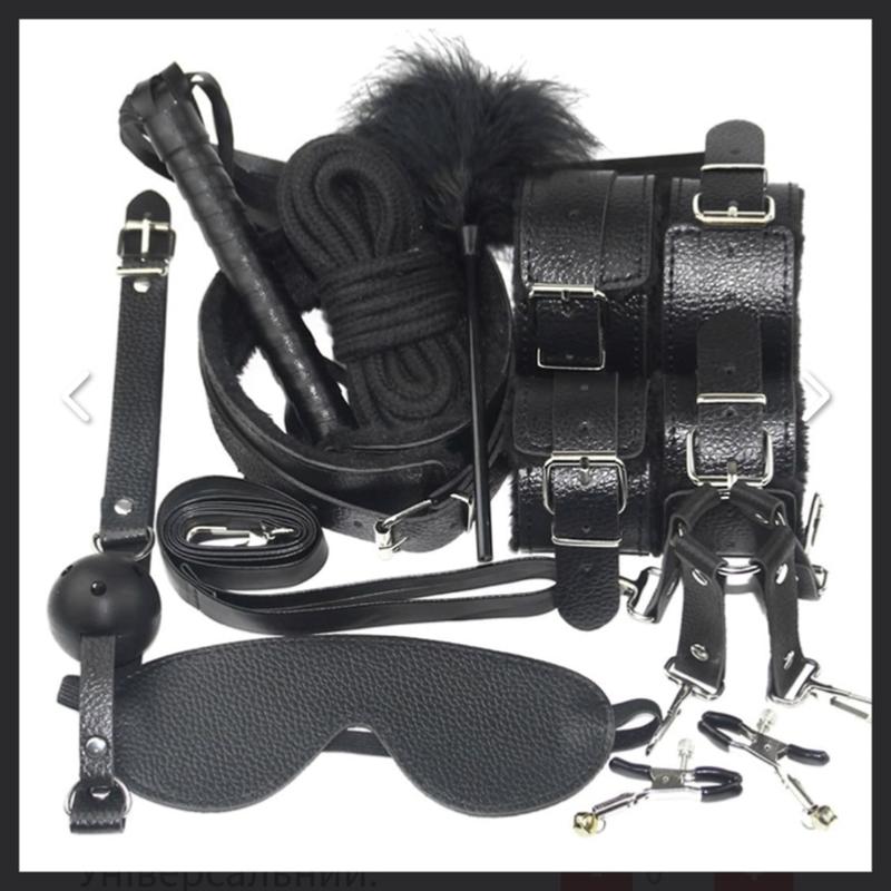1. Кожаная маска на резинке, с внутренней стороны мягкая ткань (19х7 см.). 2. Кляп: пластиковый шарик с отверстиями на кожаном ремешке с регулируемой застежкой (длина ремешка 62 см, диаметр шара 4,5 см). 3. Каждый ошейник с поводком. С внутренней части ошейника искусственных мех, есть полукольцо для поводка и ремешок с регулируемой застежкой (43х5 см., Ремешок + 8 см.). Кожаный поводок с карабином и держателем для руки (97х1 см). 4. Кожаные наручники, с внутренней части искусственного меха, на ремешке с регулируемой застежкой, соединенные цепочкой с карабином на одной стороне (27х5 см., Ремешок + 10 см). 5. Кожаные поножи, с внутренней части искусственных меха, на ремешке с регулируемой застежкой, соединенные цепочкой с карабином на одной стороне (27х5 см., Ремешок + 10 см). 6. Каждый крестовый фиксатор для соединения наручников и поножи с карабинами (25х2 см.). 7. Бандажная веревка (4,8 метра). 8. Кожаная батиг, деревянная ручка обмотана кожей и держателем для руки и 20 тонких полосок (ручка 16 см. Полоски 32 см.). 9. Перинка для лак с пластиковой ручкой (ручка 16 см., Перья 10 см.). 10. Металлические зажимы для соска с резиновыми наконечниками, шурупом регулятором и маленьким колокольчиком (6 см.). Материал: эко-кожа, искусственный мех, металл, пластик, резина, дерево, перья. Вес: 420 грамм.