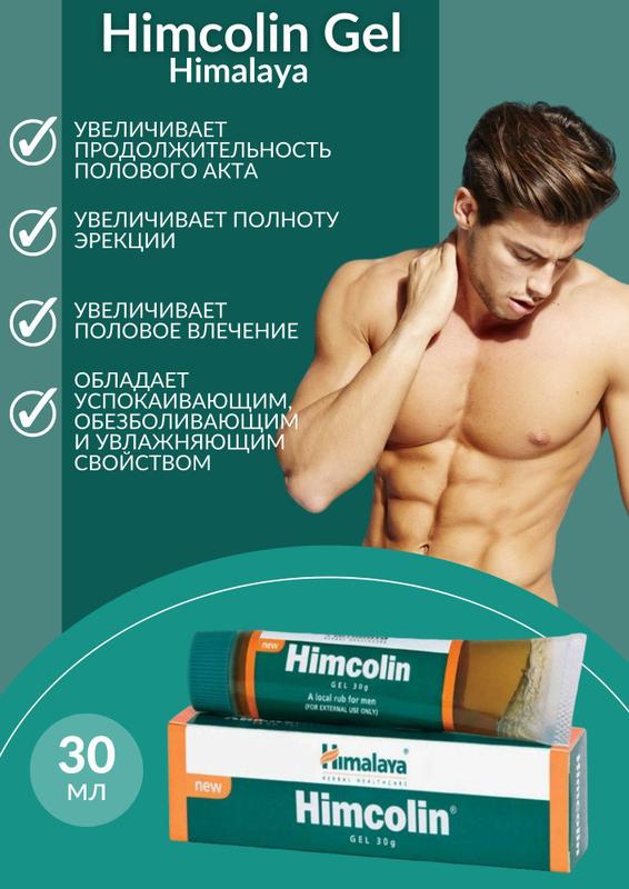 Химколин Гель Хималая укрепляет эректильную функцию и улучшает сексуальную потенцию. Мышечный релаксант: Himcolin Gel вызывает сосудистое напряжение полового члена, что усиливает и поддерживает эрекцию. При местном применении обладает противовоспалительным свойством. Антиоксидант: Натуральные ингредиенты в Himcolin Gel обладают мощными антиоксидантными свойствами, которые контролируют и предотвращают местные окислительные повреждения. Это действие исправляет нарушение кавернозной (губчатой области вокруг полового члена, содержащей значительное количество крови во время эрекции) функции эректильной дисфункции. Himcolin gel повышает способность пещеристых тел полового члена к кровенаполнению, вызывая прилив крови в сосудах благодаря их активному расширению; способствует наиболее полной эрекции и поддержанию длительности полового акта; стимулирует чувствительные афферентные нервные окончания; не подавляет чувствительность; вызывает расширение сосудов и за счет этого более полное их кровенаполнение. Показания к использованию геля Himcolin от Himalaya включают: 1. Проблемы с эрекцией. 2. Снижение сексуального влечения. 3. Кратковременный половой акт. 4. Проблемы с сексуальной активностью. 5. Сухость кожи в области пениса. 6. Недостаточная чувствительность во время полового акта Состав Масла: Джотишмати - масло семян древогубца (Celastrus paniculatus) - 200 мг Латакастхури - масло гибискуса мускусного (Hibiscus abelmoschus) - 150 мг Ватада - масло миндаля (Prunus amygdalus) - 100 мг Ниргунди - масло прутняка китайського (Vitex negundo) - 100 мг Карпаса - масло семян хлопчатника индийского (Gossypium herbaceum) - 50 мг Мукулака - масло семян фисташки настоящей (Pistacia vera) - 50 мг Джатифалам - масло скорлупы мускатного ореха (Myristica fragrans) - 30 мг Джатипатри - масло мускатного ореха (Myristica fragrans (Mace)) - 30 мг Лаванга - масло цветочных почек гвоздичного дерева (Syzygium aromaticum) - 30 мг Таджа - масло коры коричного дерева (Cinnamomum cassia) - 3 мг Способ применения: - Наносить на половой член и/или лобковую область и втирают путём легкого массирования 1-2 раза в день в течение 1-2 минут, пока крем не впитается. Курс лечения составляет 30 дней. Доза крема на курс лечения составляет 21-28 г (7 г достаточно для проведения 8-10 аппликаций). Втирайте средство мягкими массажными движениями до полного впитывания. - Наносите гель на пенис и область лобка за час до начала полового акта. Втирайте средство мягкими массажными движениями до полного впитывания. Не следует смывать сразу после нанесения на кожу. Однако если перед половым актом препарат был нанесен на кожу полового члена и лобка в избытке, необходимо удалить излишки с помощью мягкой бумажной салфетки.В ходе полового акта в незначительном количестве может попадать на слизистые влагалища партнерши, однако состав препарата безвреден, и поэтому на женщин он не оказывает никакого влияния. В силу этого применение не требует обязательного надевания презерватива чтобы не навредить партнерше. - Избегайте нанесения геля на мошонку, слизистые оболочки полового члена и головку пениса, чтобы избежать ощущения жжения. - Рекомендуемый срок использования средства - 1 месяц.