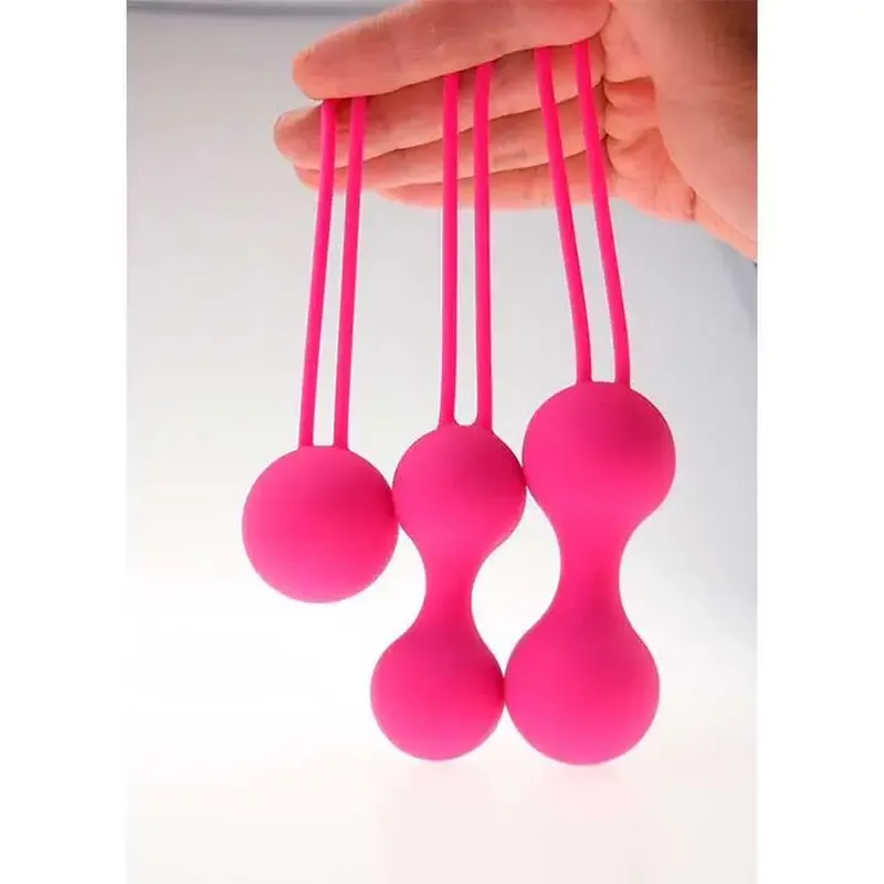 Набор силиконовых вагинальных шариков из 3 штук для тренировки и укрепления мышцы влагалища с утяжелителями. В набор входят один круглый шарик и два сдвоенных шарика разного веса и диаметра. Параметры: - Маленький одинарный: диаметр 3,5 см., общая длина 12 см., длина веревки 8,5 см., вес 36 грамм. - Сдвоенные средние: диаметр 3 см., общая длина 16 см., длина веревки 8,5 см., вес 48 грамм. - Сдвоенные большие: диаметр 3,2 см., общая длина 16,5 см., длина веревки 8,5 см., вес 63 грамм. Материал: силикон, метал. Цвет: розовый