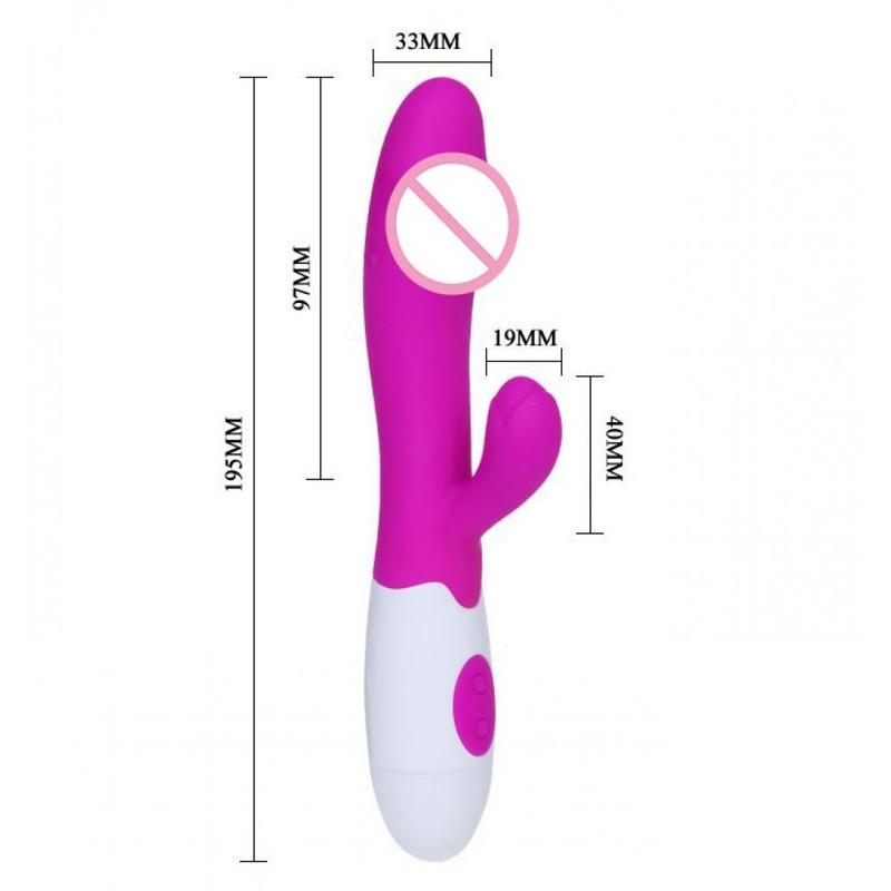 Вибратор со стимулятором клитора изготовлен из нежнейшего силикона, обеспечивающего самые реалистичные ощущения и незабываемое удовольствие Водонепроницаем, снабжен двумя моторами. Первый расположен в головке, а второй в отростке для стимуляции клитора. Управляется с помощью двух кнопок на рукоятке имеющих соответствующие обозначения. Первая - включение или выключение, а вторая - выбор одного из 30-ти режимов вибрации. Питание: 2 батарейки ААА ( в комплекте не идут).