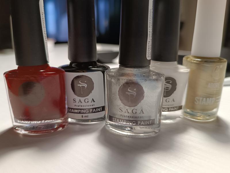 Краски для стемпинга Saga professional (черный, красный, белый, серебристый), Adore professional (золотистая) Набор из 5 шт -250 грн По штучно 70 грн/шт