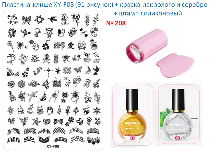 Набор для стемпинга № 208. Используется для создания рисунков на весь ноготь. 1. Штампик является один из самых важных инструментов в технике стемпинг, его используют для перемещения рисунков с клише на ноготь; 2. Скребок применяется для удаления излишков краски с клише, он позволяет качественно одним движением очистить необходимую площадь пластиковой пластины; 3.Пластина-клише; 4.Краска-лак для стемпинга, золото+серебро; Способ применения: - нанесите небольшое количество лака для стемпинга на пластину; - с помощью скребка уберите лишнюю краску с диска-клише; - придавите штамп к рисунку и перенесите его на ноготок; - после использования очистите силиконовую подушечку с помощью липкой ленты. ### ## Важно: чтобы избежать потери прозрачности и помутнения силиконовой подушечки, очищать штамп следует скотчем, а не ацетоном.