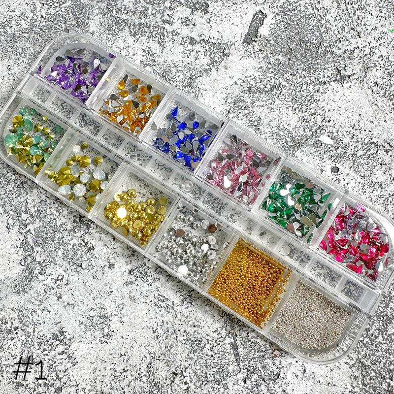 Микс декора для ногтей стразы, бульйонки №01 контейнер на 12 отсеков
