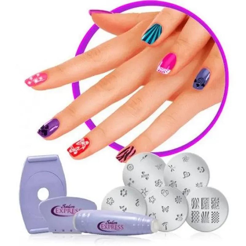 Маникюрный набор Salon Express Однако для маникюра в домашних условиях обратите внимание на инновационную разработку корейских косметологов, с помощью которой можно делать стильный маникюр в домашних условиях ― маникюрный набор для создания узоров на ногтях Салон Экспресс Нейл Арт Стемпин Кит. Незаменимая вещь для современной девушки Салон Экспресс отлично подходит как для маникюра, так и для педикюра. Теперь не нужно идти в салон красоты за красивым дизайнерским маникюром, теперь дизайнер вы, и что самое главное у себя дома. Стемпинг для ногтей Приобретя набор салон экспресс Вы сможете ухаживать за ногтями, и каждый день радовать себя яркими лаками и новыми необычными креативными рисунками. "Stamping" дословно переводится как "штамповка", то есть Вы сможете легко и быстро украсить ногти используя небольшой резиновый штампик. Он небольшой размер, простой в использовании, и не займет много места в косметичке, его можно взять с собой на отдых или в путешествие. Маникюр производится при минимальных денежных затратах, а стильные и оригинальные трафареты понравятся женщинам любого возраста. Преимущества набора для создания рисунков на ногтях многоразовое использование - в отличии от простых наклеек на ногти, штамп можно использовать многократно экономичность - не нужно каждый раз выбрасывать деньги на походы в салон красоты универсальность ― применяется с любым видом лака для ногтей. многофункциональность ― отлично подходит как для маникюра, так и для педикюра. длительный эффект - сделанный маникюр. Комплектация 5 трафаретов с 34 рисунками скребок для удаления излишков краски штамп из резины подставка для диска подарочная упаковка
