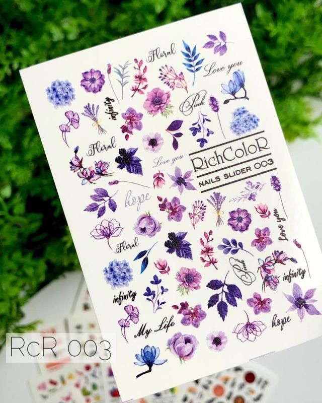 Слайдер RichColor 1. Пдготувати нігтьову пластину. 2. Знежирити нігті, нанести базове покриття, далі кольорове покриття. 3. Вибрати малюнок і обрізати необхідну частину. 4. Розмочити на вологому ватному диску паперовою основою вниз. 5. За допомогою штампа для стемпінгу або пінцета перенести малюнок на просушену основу або колір. 6. Прибрати зайву вологу. 7. Покрити топом, просушити, видалити липкий шар.