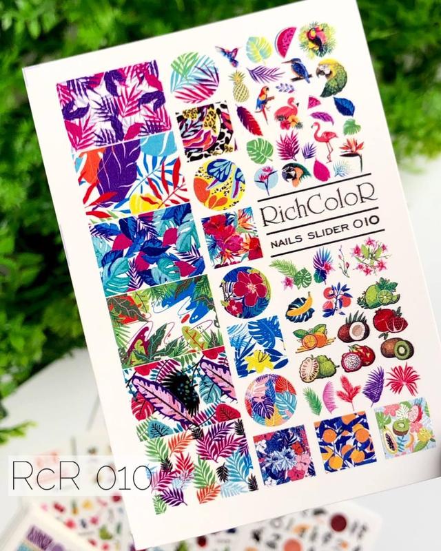 Слайдер RichColor 1. Пдготувати нігтьову пластину. 2. Знежирити нігті, нанести базове покриття, далі кольорове покриття. 3. Вибрати малюнок і обрізати необхідну частину. 4. Розмочити на вологому ватному диску паперовою основою вниз. 5. За допомогою штампа для стемпінгу або пінцета перенести малюнок на просушену основу або колір. 6. Прибрати зайву вологу. 7. Покрити топом, просушити, видалити липкий шар.
