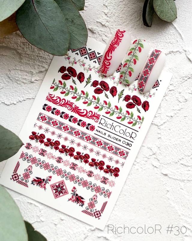 Слайдер RichColor 1. Пдготувати нігтьову пластину. 2. Знежирити нігті, нанести базове покриття, далі кольорове покриття. 3. Вибрати малюнок і обрізати необхідну частину. 4. Розмочити на вологому ватному диску паперовою основою вниз. 5. За допомогою штампа для стемпінгу або пінцета перенести малюнок на просушену основу або колір. 6. Прибрати зайву вологу. 7. Покрити топом, просушити, видалити липкий шар.