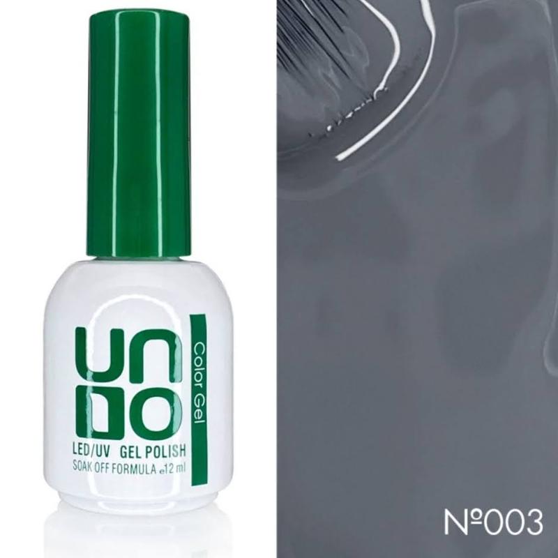 Гель лак для ногтей UNO 12мл №003. Цвет серый. Консистенция гель лака средняя – не тягучий и не растекается. Кисточка удобная. Цвет хорошо перекрывается в два тонких слоя. Быстро самовыравнивается. На фото на типсе в один слой. Время полимеризации: УФ лампа 36Вт – 2 минуты, LED лампа – 30-60 секунд.