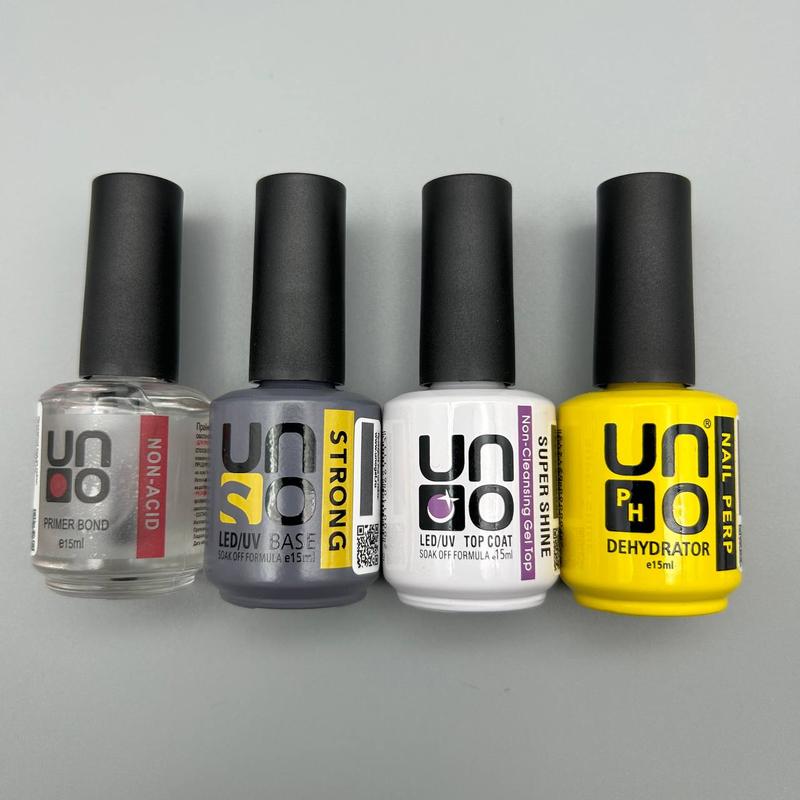 Компания «UNO» представляет современную линию косметики для маникюра. Преимущества: стойкость покрытия более 20 дней, яркий блеск, не стягивается, не трескается, не скалывается, сушится в LED/UV лампах. В комлект набора 4в1 входит: - топ (Без Липкого слоя) UNO Super Shine 15 мл - 1 шт; - база UNO Strong 15 мл - 1 шт; - праймер (Ультрабонд) UNO 15 мл - 1 шт; - дегидратор UNO 15 мл - 1 шт.