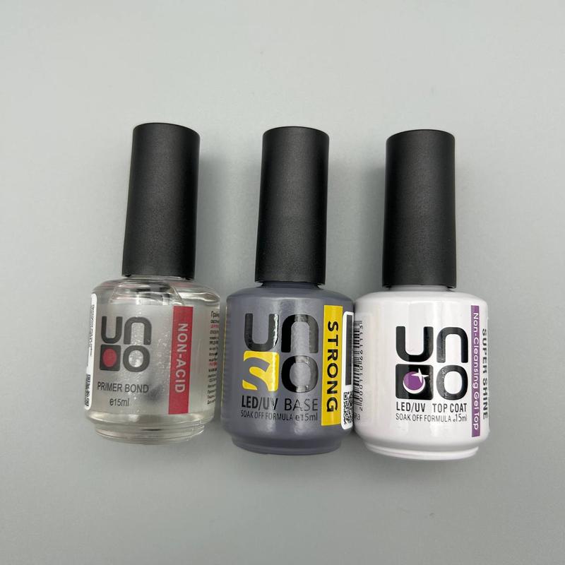 Компания «UNO» представляет современную линию косметики для маникюра. Преимущества: стойкость покрытия более 20 дней, яркий блеск, не стягивается, не трескается, не скалывается, сушится в LED/UV лампах. В комлект набора 3в1 входит: - топ (Без Липкого слоя) UNO Super Shine 15 мл - 1 шт; - база UNO Strong 15 мл - 1 шт; - праймер (Ультрабонд) UNO 15 мл - 1 шт.