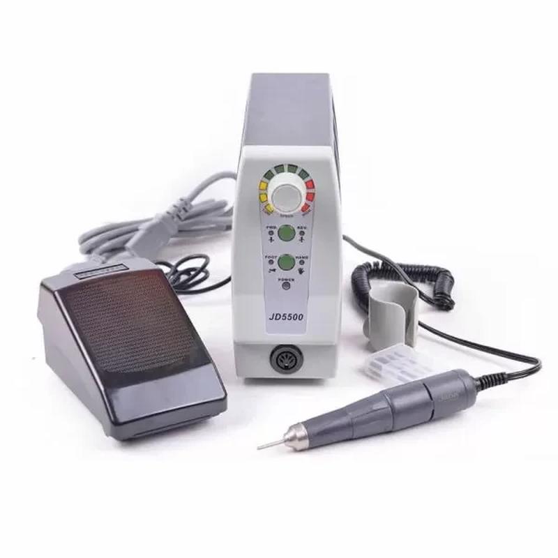 Фрезер JD-5500 -- это безупречный современный аппарат для выполнения маникюра и педикюра. Стильная модель станет не только незаменимым помощником мастера, но и подойдет для любого интерьера салона красоты и рабочего стола. Благодаря интересному дизайну и эргономичной форме, Фрезер JD-5500 выделяется среди других подобных аппаратов. Работая с ним, мастер и клиент могут быть уверены в безопасности выполняемых процедур. Высокая мощность 85 Вт и скоростной мотор позволяют ежедневно выполнять суточную норму работы без потери качества самого фрезера. А низкий уровень шума и вибраций превращают процесс маникюра и педикюра в приятное удовольствие, не нарушаемое ничем посторонним. Ручка с микромотором медленно нагревается и быстро охлаждается в процессе эксплуатации. Максимальная скорость вращения насадки - до 35000 оборотов в минуту. Имеет два направления вращения: прямое и обратное. Переключение реверса происходит без выключения и остановки микромотора. Есть встроенный предохранитель, защищающий от перепадов напряжения. Уникальная вариационная педаль, входящая в комплект, не имеет аналогов в мире фрезеров. Она не только помогает перейти с ручного режима управления на ножной, но и способна регулировать скорость работы с помощью плавного нажатия. Современную педаль можно сравнить в управлением автомобилем - плавно выжимая и отпуская, Вы управляете скоростью процессов, а также легко начинаете и заканчиваете их.