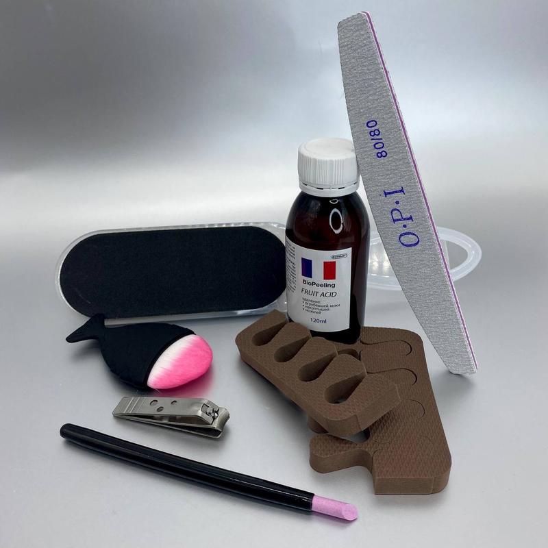 Набор для педикюра 03 Цена 310 грн В набор входит: 1. Ремувер пилинг для педикюра BioGel Aloe Vera 120 мл 2. Щетка-рыбка для пыли 3. Книпсер для ногтей 4. Пилочка для шлифовки 5. Пилочка для ногтей 6. Разделитель для пальцев (пара) 7. Пластиковый пушер с европемзой