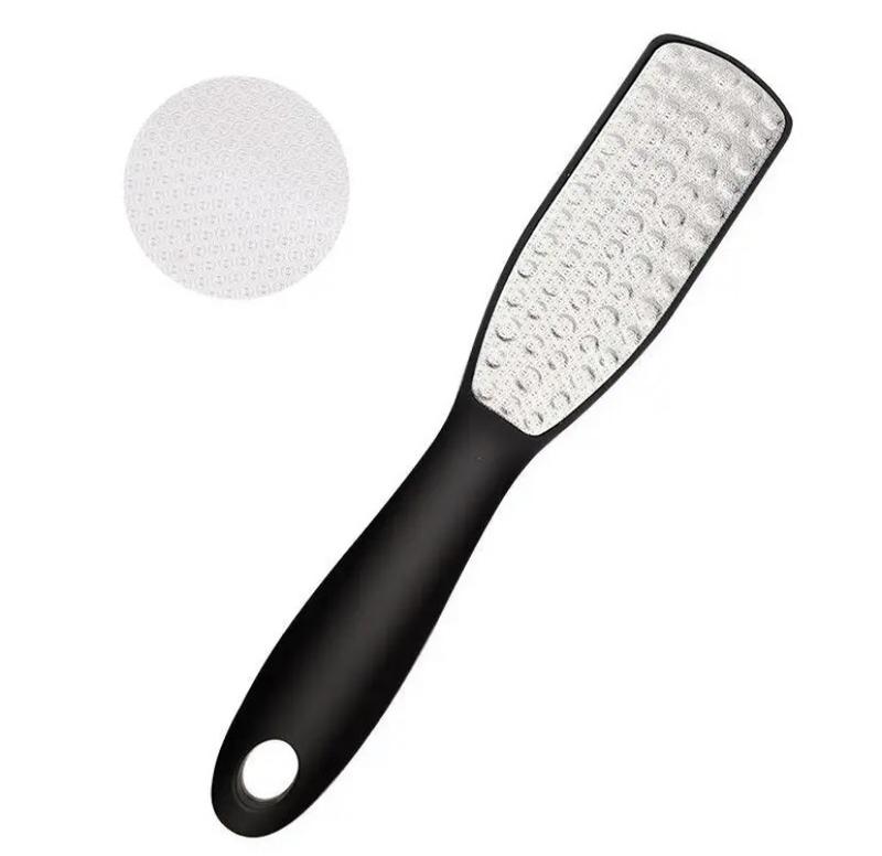 Шліфувальна тертка для ніг з нержавіючої сталі - ефективний педикюрний інструмент, що забезпечує бездоганний результат. Основні переваги: - Дві робочі поверхні подовженої форми: одна сторона виробу призначена для ретельного видалення шару ороговілого на п'ятах, а інша -- для акуратного шліфування. - Борозни, що відлущують, на тертці виконані лазером. - Інструмент чудово прибирає омертвілі клітини, не травмуючи шкіру. - Виробом легко керувати завдяки комфортній ергономічній ручці. - За допомогою цієї педикюрної приналежності ви легко усунете натоптиші, грубі мозолі, додайте п'ят гладкість і доглянутий, акуратний вигляд. Колір: чорний Вага: 95 г