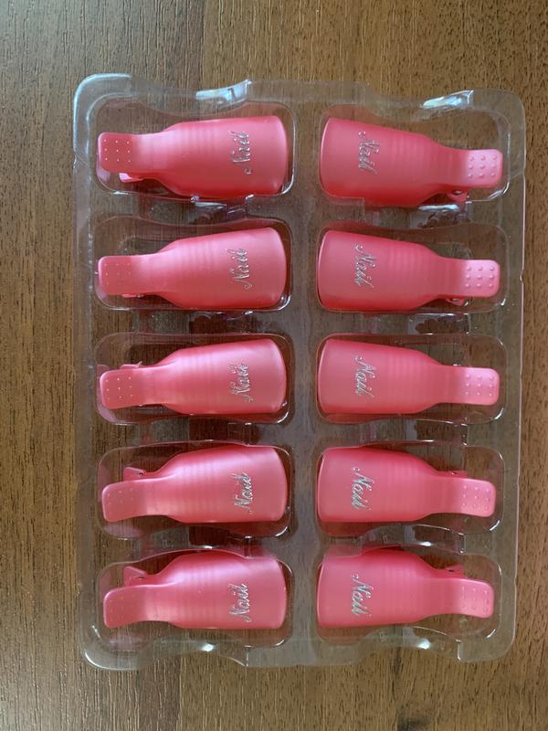 Набір з 10 прищіпок, затискачів-кліпс для зняття гель лаку. Прищіпки пластикові, рожевого кольору.