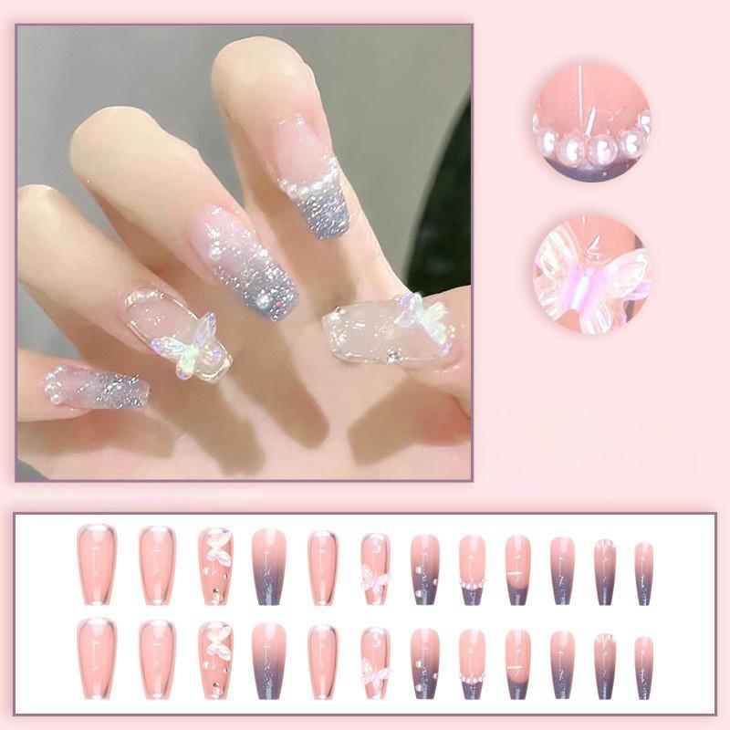 Накладные ногти 24 штуки с клеем для приклеивания в комплекте Особенности использования искусственных ногтей: - Материал: изготовлены из высококачественного материала, что обеспечивает долговременную форму и предотвращает растрескивание. - Удобство в применении: легко наносятся на естественные ногти, не требуют специальных навыков и не нуждаются в профессиональной помощи. - Отсутствие вредных веществ: не содержат формальдегида, толуола и других химических веществ, что обеспечивает их безопасность для ногтевых пластин. - Долговременная способность: могут сохранять свою оригинальную привлекательность до 2 недель. - Широкий выбор размеров, что позволяет выбрать идеальный вариант для каждой ногтевой пластины. Эти стильные накладные ногти добавят вашему образу утонченности и очарования. Легкие в использовании и долговечные, они идеально подойдут для любого мероприятия. - Блестящий эффект - Украшены объемными бабочками - Градиентный дизайн - Прочные и удобные в использовании - Подходят для многоразового использования
