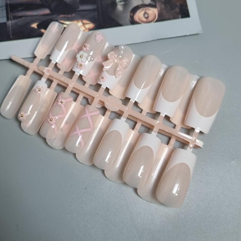 24 шт. середніх балетних рожевих бантів та біло-рожевих квітів дизайн french tip накладні...