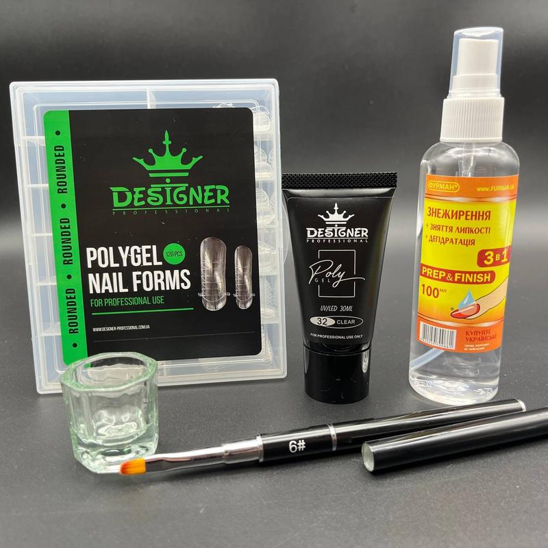Набор для наращивания 5в1 (верхние формы, полигель designer 30 мл, кисть)