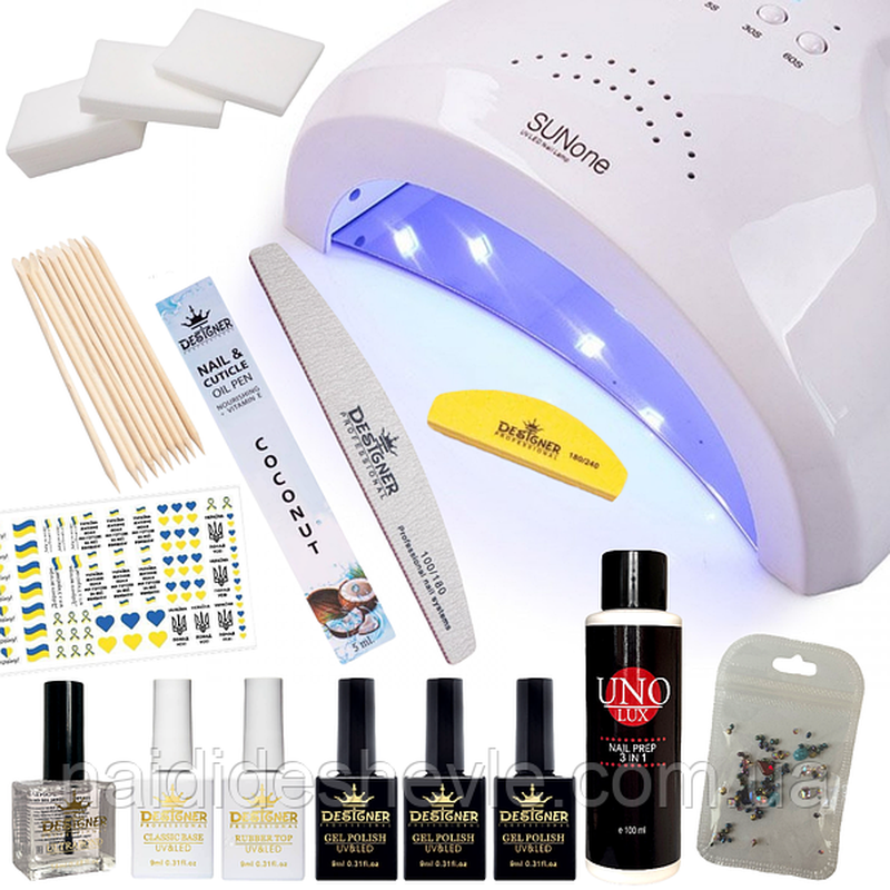 Набір стартовий (подарунковий) для починаючого майстра манікюру/педикюру з лампою SUNone і гель-лаками Designer