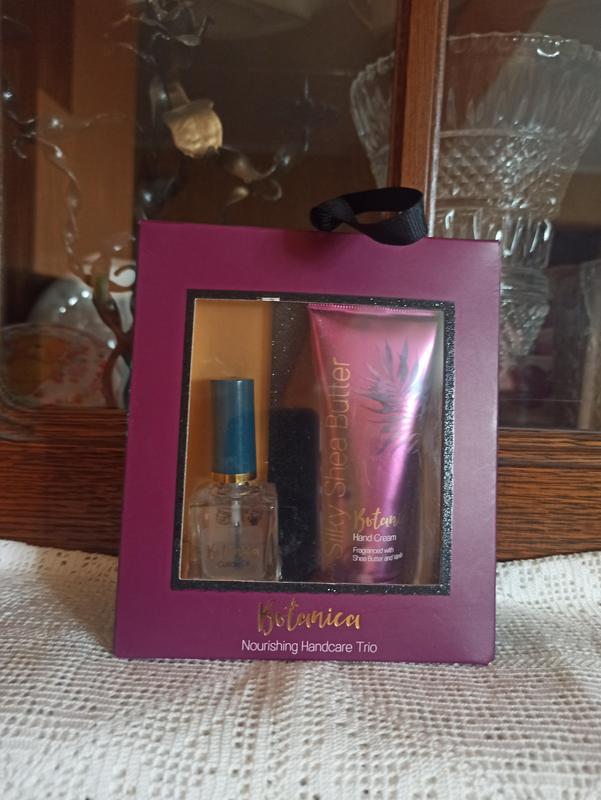 Набор для рук и ногтей фирмы Botanica, крем для рук, масло для кутикулы и пилочка.