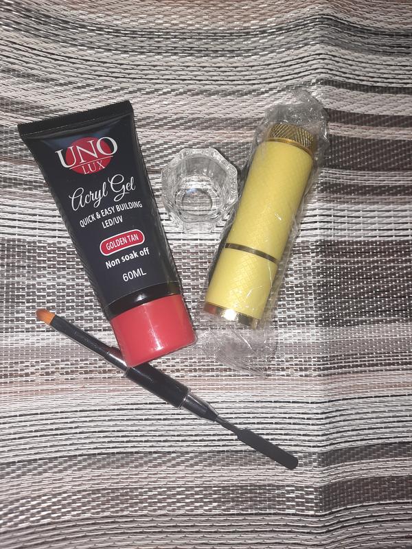Набір для манікюру полігель Уно 60 мл,лед фонарик (фіксатор)на батарейках (не в ходять у комплект),кісточка- шпатель ,склянний емність для дисперсії