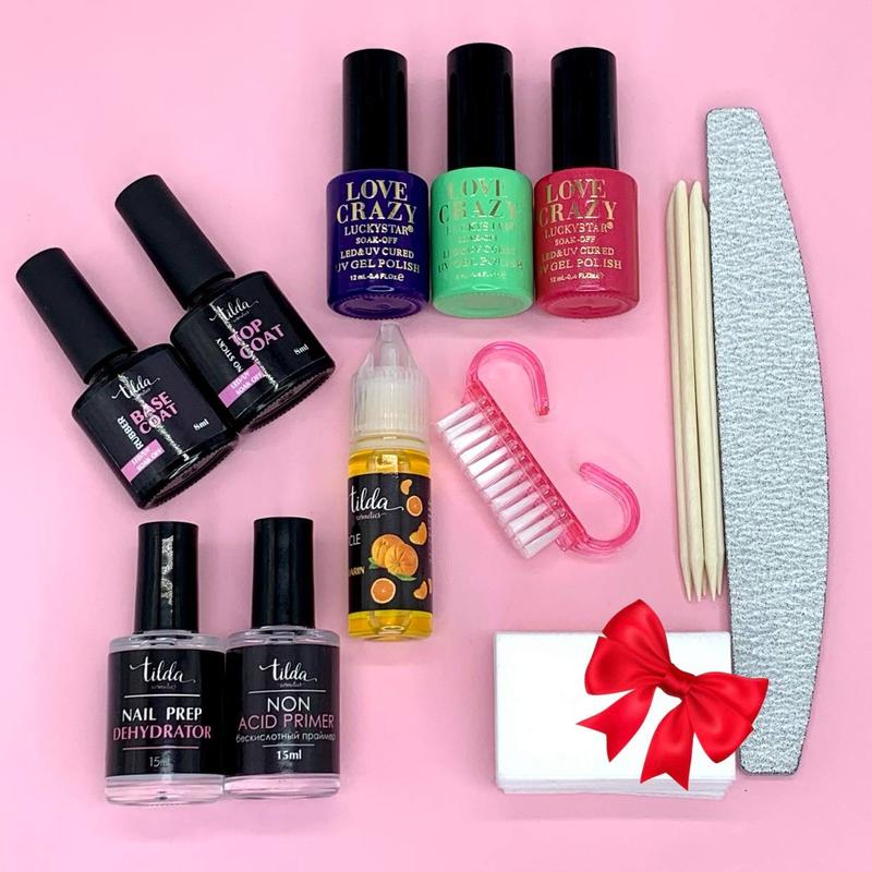 Набір для манікюру Ціна набору 655 грн 1. Каучуковий топ Tilda cosmetics 8 мл 2. Каучукова база Tilda cosmetics 8 мл 3. Гель лак Love Crazy 3 шт. (на вибір) 4. Безкислотний праймер Tilda cosmetics 15 мл 5. Nail Prep Tilda Cosmetics, дегідрататор з пензликом 15 мл 6. Олійка для кутикули Tilda Cosmetics 15 мл 7. Апельсинові палички 5 шт 8. Пилочка для нігтів 9. Щітка для пилу 10. Безворсові серветки 50 шт в 🎁