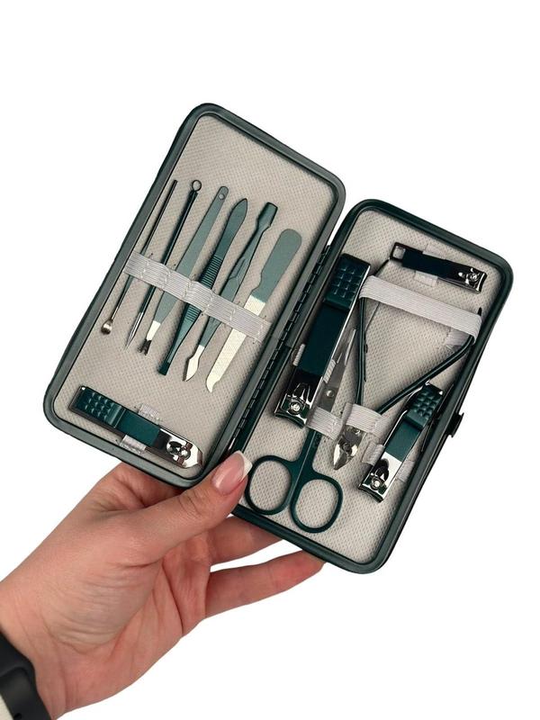 Набір для манікюру та педикюру. Для щоденного догляду за нігтями. Містить 12 інструментів - лопатку, ножиці, пилочку, пінцет, скребок та інше. Матеріал - нержавіюча сталь. Упаковка - футляр.