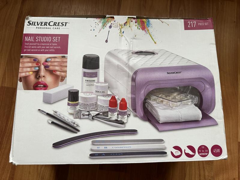Полный стартовый комплект из 217 деталей УФ-устройство для естественного укрепления ногтей, нового моделирования и наращивания Автоматическое отключение: выбирается через 90/150/240 секунд Аксесуари: 2x клей для ногтей (3 г) 2х УФ-гель прозорий, 15 мл) 1x французский гель (белый, ок. 5 мл) 1х масло для ногтей (около 4 мл) 1х разделочный раствор (около 100 мл) 1x наждачная бумага 1x шлифовальный блок 3x полировка файла (тонкая, средняя и грубая) 1x штовхач для кутикули 1х пензлик 1-точечный аппликатор с разными насадками 100x целлетов 100x кончики ногтей разных размеров 1х нож для ногтей Характеристики Потребляемая мощность: 45 Вт 4 лампы UVA: UVA-9 Вт, съемные около Ш 21 х 13 х Д 28 см