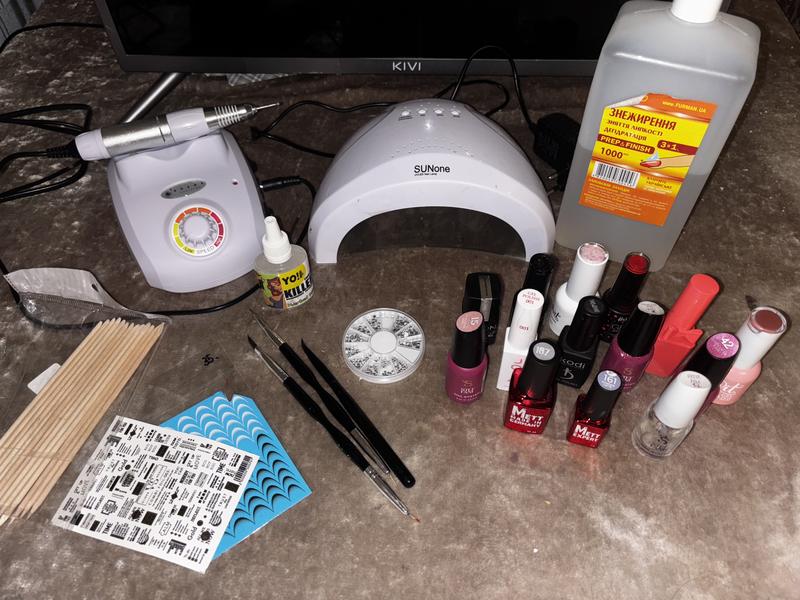 В набор входит: -Фрейзер(есть несколько насадок) -Лампа -Гель лаки(были в использовании, но все почти полные) -Апельсиновые палочки -Обезжириватель -Средство для смягчения кутикулы -Косточки -Наклейки -Каменцы -База -Топ -Праймер