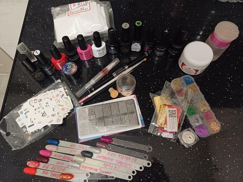 Материалы набор для маникюра: гель-лаки, гель для наращивания, два топа, кисточки, фольга, декор, штамп, беспроводные салфетки, дигидратор и др. Материалы качественные, много лаков почти полные, цвета затребуются.