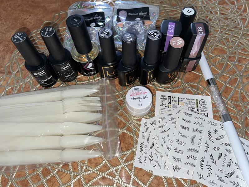 Топ світловідбиваючий Топ з крихтами для дизайну Ультрабонд від Каро новий Гель з сухоцвітами 5 г Гель лаки 7 шт ( майже всі повні ) Палітра для викраски нова Втирка 2 шт нові Кисточка і наклейки в подарунок