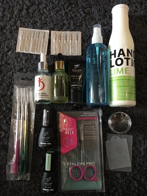 Бокс для манік‘юру: набір кісточок, фрези, ремувер, ножиці, полігель, кольорова база, топ, крем для рук, штамп для стемпінга, олійка для кутикули, знежирювач для нігтів. Можна придбати все разом, можна окремо кожен продукт