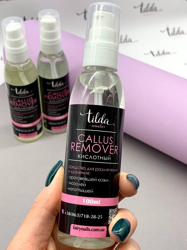 Кислотный пилинг для педикюра Tilda cosmetics Средство для размягчения огрубевших участков стоп Объем 100 мл Цена 79 грн Callus Remover (Каллус ремувер) - средство специально разработано для размягчения и дальнейшего удаления огрубевших и ороговевших участков кожи стоп. Помимо своей основной функции средство еще благотворно влияет на кожу, питает и смягчает ее благодаря эфирным маслам, входящим в состав. Молочная кислота дает увлажняющий, отбеливающий и противовоспалительный эффект. Вместе с другими кислотами, она входит в состав средства для химического пилинга, воздействуя на процессы регенерации кожи, на очищение отмерших клеток. Способ применения: 1. Замочите ступни в теплой воде, чтобы огрубевшая кож размягчалась. 2. Нанесите на стопы средство и подержите около 5 мин. Для улучшения результата можно окутать стопы полиэтиленовой пленкой или пакетом. 3. Снимите остатки средства и удалите огрубевшую кожу с помощью аппарата или пилы. 4. После процедуры нанесите на кожу стоп увлажняющий крем.