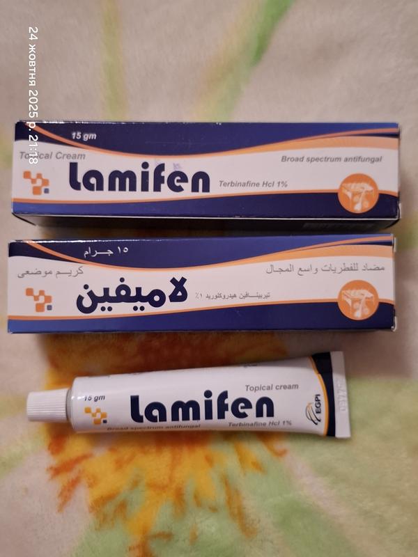 Lamifen противогрибковый крем Египет Египетская мазь Ламифен предназначена для наружного применения. Она оказывает фунгицидное действие против плесневых грибов, дерматофитов и некоторых дыморфных грибов. Это достигается за счет подавления биосинтеза стеролов в клеточных мембранах грибов на начальном этапе их образования. Препарат эффективен при следующих заболеваниях: Кожные инфекции, вызванные дерматофитами Trichophyton (T.mentagrophytes, T.verrucosum, T.rubrum, T.violaceum), Epidermophyton floccosum и Microsporum canis. Эпидермофития стоп (межпальцевая, также известная как "стопа атлета"). Дерматофития туловища (в народе – "стерегивающийся лишай"). Дерматофития подмышечная (известный как "свербиж жокея"). Разноцветный лишай (прикрытый Pityrosporum orbiculare, также известный как Malassezia furfur). Для дрожжевых грибков активность мази может быть как фунгистической, так и фунгицидной – в зависимости от вида грибка. Способ применения: Обрабатываемый участок предварительно промыть, очистить и высушить. Нанести тонким слоем, слегка массируя, дать впитаться. Частота применения: 1 раз в сутки. Курс лечения: 7-14 дней. Не прерывать курс, поскольку это может привести к рецидиву. Избегать контакта с глазами и желудком. Хранить в недоступном для детей месте. Продолжительность курса в зависимости от заболевания: Межпальцевая эпидермофития стоп: 1 раз в сутки, не более 7 дней. Паховый дерматомикоз: 1 раз в сутки, курс – 7 дней. Дерматомикоз туловища: 1 раз в сутки, не более 7 дней. Разноцветный лишай: 1 раз в сутки, курс не должен превышать 7 дней. Противопоказания: Непереносимость тербинафина или любого компонента в составе. Поражения кожи лица. Избегать контакта младенца с обработанным участком (например, у родителей или людей, проживающих вместе). При попадании в желудок – немедленно вызвать рвоту. При попадании на слизистые оболочки или в глаза – быстро промыть большим количеством теплой воды. Состав: Действующее вещество: тербинафина гидрохлорид – 10 мг на 1 г геля. Вспомогательные вещества: феноксиэтанол, этилгексилглицерин, пропиленгликоль, диметикон, изопропилмиристат, полисорбат 60, сорбитанстеарат, фосфат гидроксипропилкрохмаля, гидроксиксид натрия, очищенная вода.