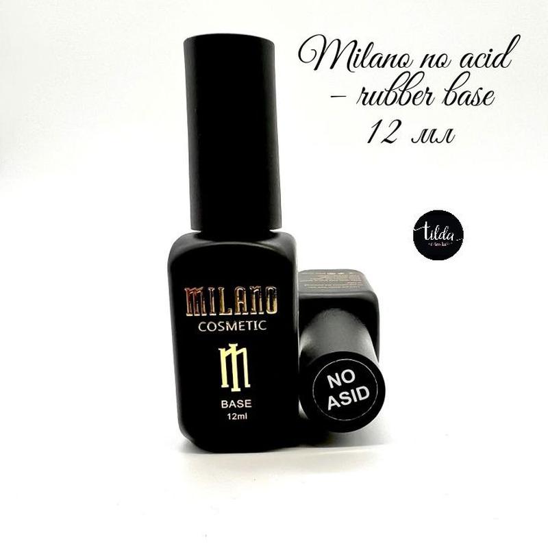 MILANO NO ACID – RUBBER BASE Об'єм 12 мл Ціна 160 грн Безкислотна база MILANO – це щадне базове покриття для манікюру. База середньої консистенції, прозорого кольору на основі каучукових волокон. Застосовується як фундаментний шар перед покриттям гель-лаком. База Milano лягає тонким шаром і має ефект, що самовирівнюється.