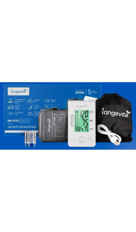Описание Longevita DBP-6179 Comfort+: Автоматический тонометр Longevita DBP-6179 Comfort+ сочетает все самые современные технологии в области медицинской техники и воплощает их в простые и надежные в использовании товары, отвечающие интересам наших требовательных клиентов. Тонометры Longevita серии Comfort+ - приборы австрийского качества и функциональности, с особым вниманием к деталям и потребностям людей разных возрастов и используют современные технологии - в измерении давления происходит на этапе нагнетания воздуха в манжету , что делает процесс измерения более легким и комфортным для пользователя. Такой способ измерения позволяет значительно сократить время измерения (всего около 30 сек) и предотвращает чрезмерное нагнетание воздуха в манжету и неприятное сдавливание руки. Современный дизайн, четкий, большой жидкокристаллический дисплей, трехцветная подсветка , большие цифры, хорошие углы обзора, индикатор правильного наложения манжеты и индикатор движения, порт питания TYPE-C - это делает его удобным и комфортным в повседневном пользовании. Longevita заботится о своих клиентах, поэтому комплектует тонометры качественными и удобными манжетами. В комплект к тонометру, модель DBP-6179, входит увеличенная манжета (22-42 см) - универсальная. Благодаря широкому размеру липучки манжета легко фиксируется на руку. Для изготовления манжеты используются гипоаллергенные синтетические материалы. Ее край имеет мягкую окантовку для снятия давления на руку. Для снятия точных показателей АД человеку достаточно правильно зафиксировать манжету на плече и нажать одну кнопку. Через несколько секунд на дисплее высвечиваются данные и в зависимости от соответствия результатов рекомендованному классификатору давления по нормам ВОЗ дисплей подсветится одним из трех цветов (зеленый, желтый, красный). Высокая точность измерения позволяет использовать устройство не только для домашнего использования, но и в различных медицинских учреждениях. Особенности автоматического тонометра на плечо Longevita DBP-6179 Comfort+: ¤ Конусообразная манжета c универсальным размером 22-42 см ¤ Индикатор аритмии ¤ Трехцветный экран с подсветкой ¤ Индикатор движения. Если при измерении происходит движение руки, то индикатор сообщает об этом. Это указывает на то, что результаты измерений могут быть неточными. ¤ Индикатор правильного расположения манжеты. Если манжета расположена неправильно или слишком свободно зафиксирована на плече, индикатор об этом сообщит. ¤ Среднее значение 3-х последних измерений, позволяющее более четко определять уровень давления ¤ Автоматическое отключение после измерения ¤ Память по 150 значений для каждого из двух пользователей, ¤ Индикатор батареи, дата и время Технические характеристики тонометра автоматического на плечо Longevita DBP-6179 Comfort+: • Метод измерения: осциллометрический • Алгоритм измерения: Inflation Measuring System (измерение при нагнетании воздуха в манжету) • Трехцветная подсветка; • Дисплей 66,4 мм (мм) х 43,1 мм (мм) • Нагнетание воздуха в манжету: автоматическое • Размер манжеты: универсальная (22-42 см) • Индикация аритмии: да • Диапазон измерения пульса, ударов в мин: 30-180 • Точность измерения пульса: ±5 % • Точность измерения АД: ±3 мм рт. ст. • Память, ячеек: 150 измерений, пользователей 2 • Дополнительные функции: календарь и часы • Источник питания: 3 батарейки типа AAA (в компл